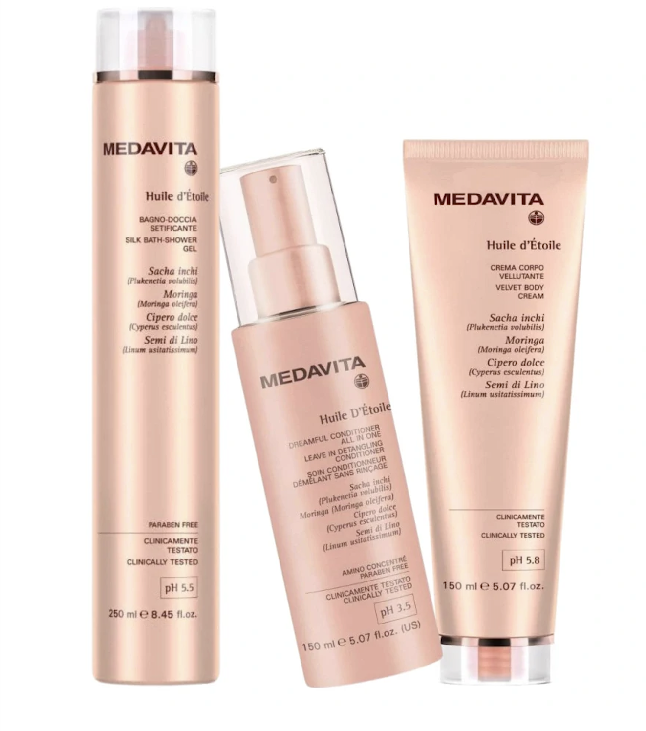 MedaVita Huile d'Étoile šampón OLI s pH 5,5 z iluminační řady MedaVita Huile d'Étoile (Hvězda mezi oleji) je určen pro hloubkovou výživu a dodání neuvěřitelného lesku všem typům vlasů. Vlasy navíc chrání před dehydratací a poškozováním. Složení šampónu je založeno na mixu blahodárných olejů (Sacha inchi, šáchor jedlý – zemní mandle, lněná semínka a moringa). Oleje dodávají vlasům nejen výživu, ale také ochranu s antioxidačním působením. Složení šampónu je navíc doplněno o komplex Amino Concentrée, který ve vlasovém stonku uzamyká blahodárné ingredience a tím zvyšuje účinnost exkluzivních olejů a také prodlužuje dobu péče a působení.