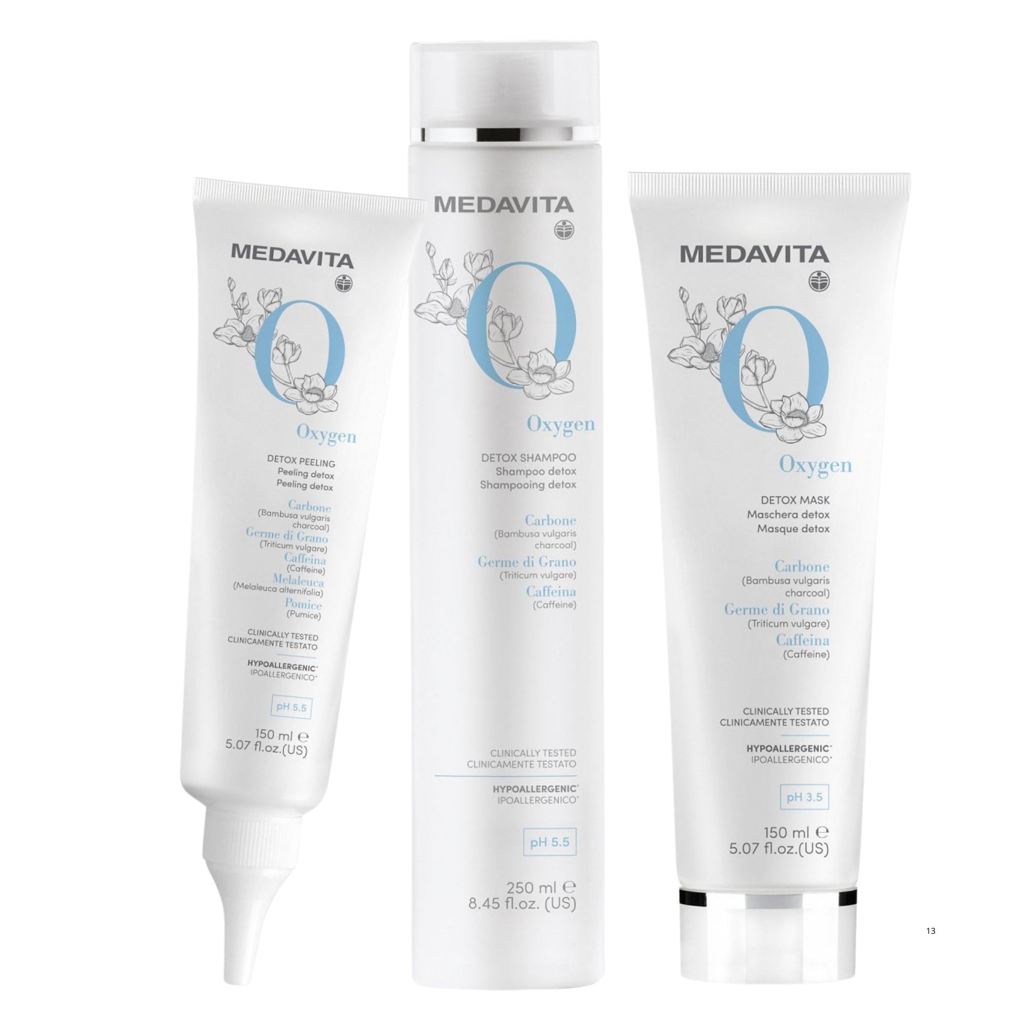 MedaVita Oxygen (Shampoo detox rivitalizzante pH 5.5) okysličující a detoxikační šampón, který poskytuje maximální péči jak vlasové pokožce, tak vlasům samotným. Díky bambusovému uhlí, kofeinu a pšeničným klíčkům vlasovou pokožku okysličuje, zbavuje nečistot v podobě nahromaděného prachu, smogu nebo mazu. Zároveň obnovuje buňky a pomáhá tak vytvářet velmi přívětivé prostředí a půdu pro růst zdravých, pevných a silných vlasů. Mix složek zároveň poskytuje vlasovým délkám vitalitu, výživu a omlazující efekt.