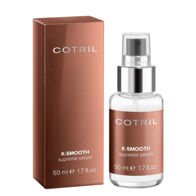 Uhlazující vlasové sérum Cotril K-Smooth (Supreme Serum) je opravdovým šperkem řady K-Smooth od Cotrilu. Jen pár kapek vyhlazujícího séra K-Smooth dokonale zakončí každé ošetření vlasů. Sérum dodá vlasům každý den překvapující WOW efekt. Díky obsahu vybraných silikonů poslední generace vlasům dodává okamžitých lesk a usnadňuje jejich rozčesávání. Nezanechává zbytky, nemastí a neobsahuje alkohol. K-Smooth Supreme sérum díky svému exkluzivnímu složení vlasy okamžitě upravuje, oživuje, dodává jim hedvábný lesk. Nejedná se o běžné sérum pro konečnou úpravu vlasů, sérum vlasy také okamžitě uhlazuje a narovnává a nabízí tak expres uhlazení!