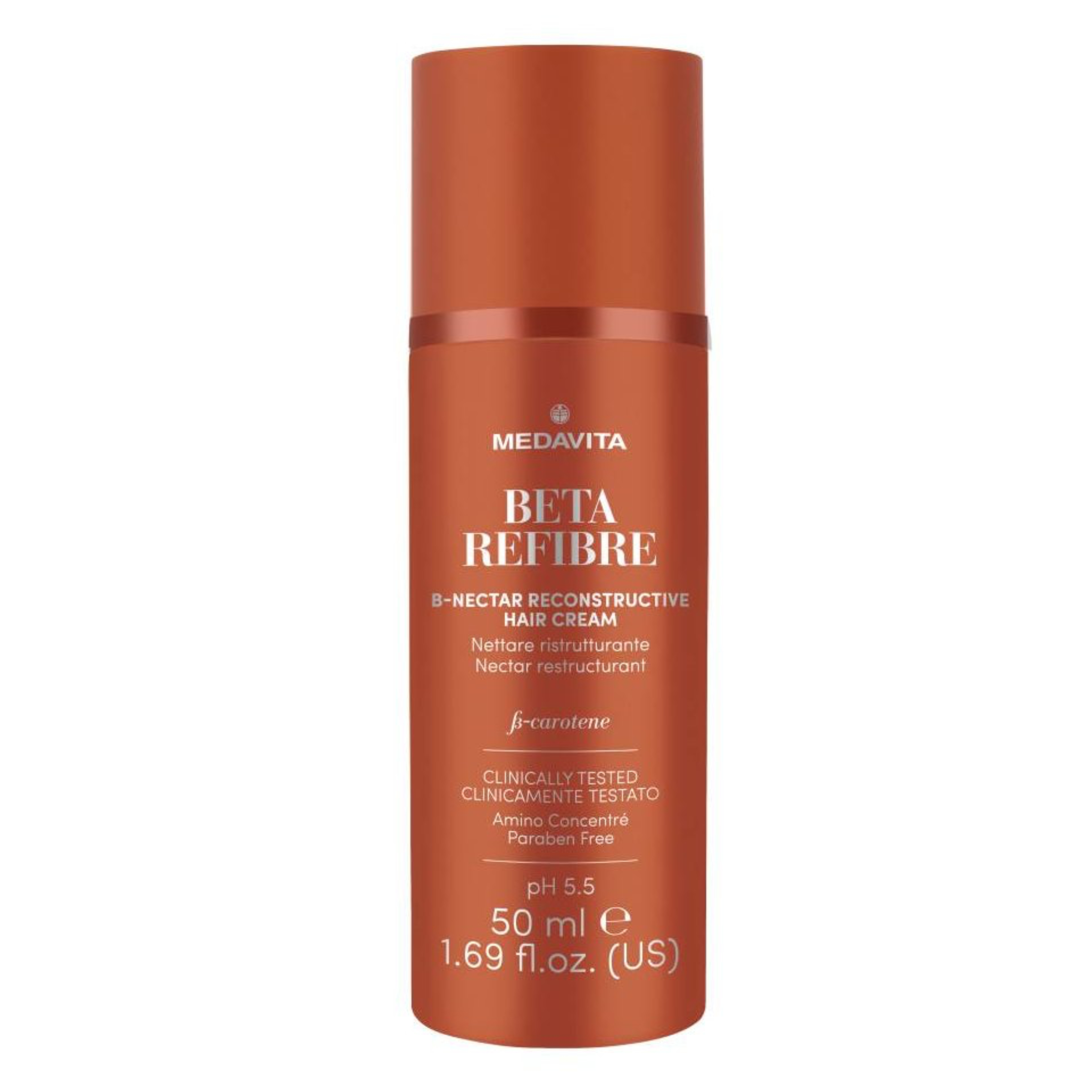 MedaVita Beta Refibre obnovující vlasový krém - nektar na vlasy (B-Nectar Reconstructive Hair Cream pH 5.5) je zkrášlující nektar na vlasy s okamžitým kosmetickým účinkem. Rekonstrukční nektar již od první aplikace dodává vlasům poddajnost a lesk. Betakaroten s obnovujícími účinky chrání vlasy před poškozením způsobeným fyziologickými procesy dehydratace a stárnutí a také před negativními účinky v důsledku chemického ošetření vlasů a působení znečištěného okolního prostředí. Nektar obohacený o sezamový olej dodává oslabeným, unaveným, vyčerpaným vlasům bez lesku intenzivní výživu a lesk. Jeho složení s obsahem vzácného komplexu Amino Concentrée přináší vlasům dlouhodobé obnovující účinky.