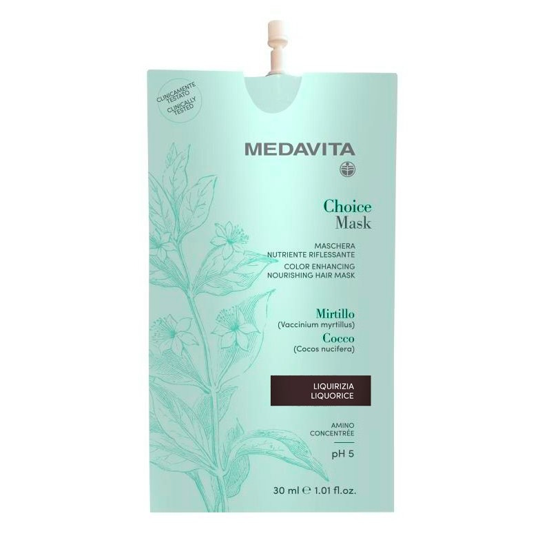 MedaVita Choice barvící a vyživující maska nejenže vlasy tónuje, ale zároveň jim dodává lesk, sílu a hebkost. Masky Choice nahrazují velmi úspěšné masky MedaVita Enjoy. Nová vylepšená receptura bohatá na intenzivní pigmenty a vyživující složky. Maska je k dispozici v jedenácti odstínech (stříbrný, zlatý, béžový, karamelový, měděný, červený, lilkový, hnědý studený, broskvové, oříškové a lékořicové). Řadu jedenáctvi odstínů doplňuje neutrální maska MedaVita Choice Neutro bez pigmentace. Maska Neutro je vhodná pro zjemnění intenzity odstínů ostatních masek, čímž je možné dosáhnout na pastelové tóny a decentní barevné odlesky. Všechny odstíny masek je možné vzájemně míchat, tím je možné dosáhnout na nekonečné barevné variace.