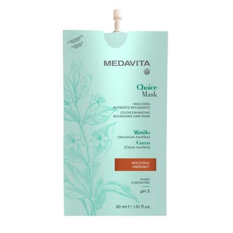 MedaVita Choice barvící a vyživující maska nejenže vlasy tónuje, ale zároveň jim dodává lesk, sílu a hebkost. Masky Choice nahrazují velmi úspěšné masky MedaVita Enjoy. Nová vylepšená receptura bohatá na intenzivní pigmenty a vyživující složky. Maska je k dispozici v jedenácti odstínech (stříbrný, zlatý, béžový, karamelový, měděný, červený, lilkový, hnědý studený, broskvové, oříškové a lékořicové). Řadu jedenáctvi odstínů doplňuje neutrální maska MedaVita Choice Neutro bez pigmentace. Maska Neutro je vhodná pro zjemnění intenzity odstínů ostatních masek, čímž je možné dosáhnout na pastelové tóny a decentní barevné odlesky. Všechny odstíny masek je možné vzájemně míchat, tím je možné dosáhnout na nekonečné barevné variace.
