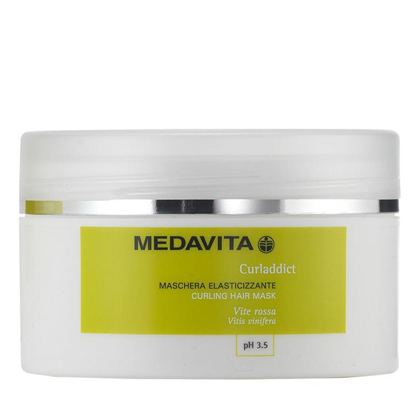 MedaVita Curladdict Maska pro elastičnost vlasů pH 3,5 (Maschera Elasticizzante) je super zjemňující maska pro elastičnost určená pro vlnité, kudrnaté a husté vlasy. Obsahuje výtažky z vinné révy a jojobový olej. Přilne k vlasům, čímž je chrání před mechanickými a vnějšími agresemi, odhaluje jejich přirozenou smyslnost a usměrňuje je díky pružné definici. Obohacená o cenný komplex Amino Concentrée prodlužující dobu pružnosti.