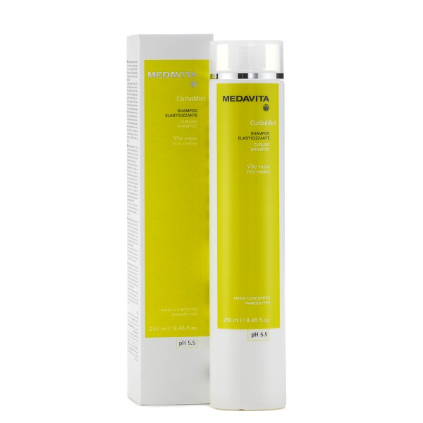 MedaVita Curladdict Šampón pro elastičnost vlasů pH 5,5 (Shampoo Elasticizzante pH 5,5). Šampón pro elastičnost určený pro vlinité, kudrnaté a husté vlasy obsahuje výtažky z vinné révy, myje bez zatížení, kudrlinám a vlnám daruje sinusový tvar, vlhkost, snadnou úpravu a maximální pružnost. Obohacený o cenný komplex Amino Concentrée prodlužující dobu pružnosti.