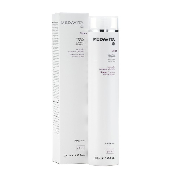 MedaVita Velour Šampón pro citlivou pokožku pH 5,5 (Shampoo Lenitivo pH 5,5) je zklidňující šampon pro citlivou pokožku, vhodný pro časté mytí. Zklidňující a protizánětlivé vlastnosti levandule a proteinů z obilných klíčků jemně působí na pokožku, zklidňují podráždění a přináší okamžitou úlevu. Šampon zanechává vlasy hebké, snadno upravitelné a lesklé. Složení obohacené o Allantoin účinně regeneruje buňky vnější vrstvy kůže (epidermis). Zklidňující šampon je speciálně určený pro citlivou a podrážděnou vlasovou pokožku. Šampón má velmi řídkou konzistenci, což velmi usnadňuje důkladné oplachování zbytků šampónu.