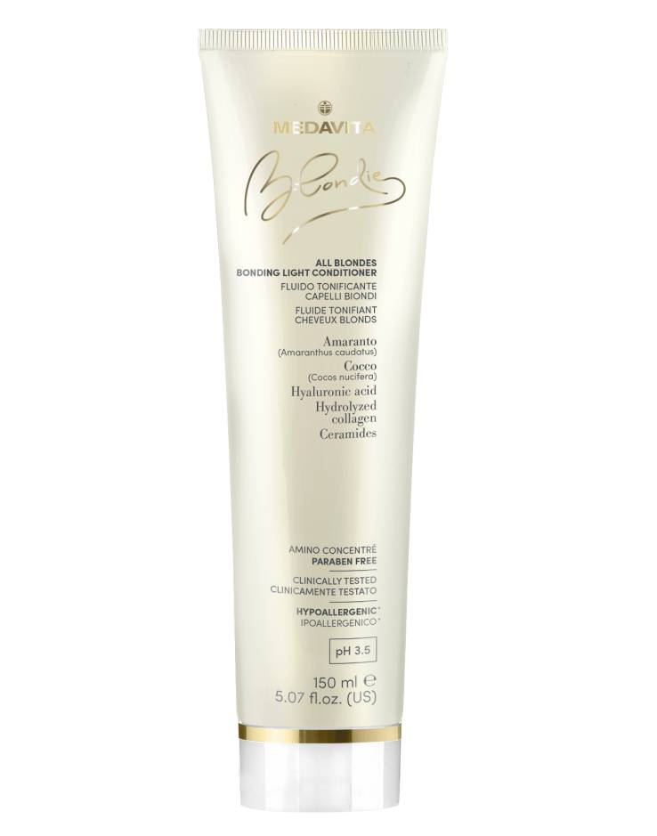 Medavita Blondie All Blondes Bonding Light Conditioner s pH 3,5 je posilující vlasový kondicionér určený pro všechny typy blond vlasů. Kondicionér poskytuje blond vlasům potřebnou péči, posiluje a vyzdvihuje jejich charakteristicky citlivou strukturu. Vlasy zanechá lehké, hebké a objemné. Posilující bonding systém Medavita Blondie vyrovnává přirozené pH vlasů a stabilizuje vnitřní struktury citlivých blond vlasů, které jsou náchylné na poškození. Pečlivě vybrané aktivní složky udržují blond vlasy silné a zdravě vypadající. Aktivní složky na bázi komplexu kokosového oleje, proteinů amaranta, kyseliny hyaluronové, tekutého kolagenu a ceramidů poskytují vlasům dlouhodobou hydrataci, zpevnění a ochranu. Kondicionér napomáhá uzavírat povrch vlasů a činí je odolnější. Kondicionér zvyšuje ovladatelnost vlasů a usnadňuje jejich rozčesávání. Kondicionér je dermatologicky testován a je hypoalergenní.