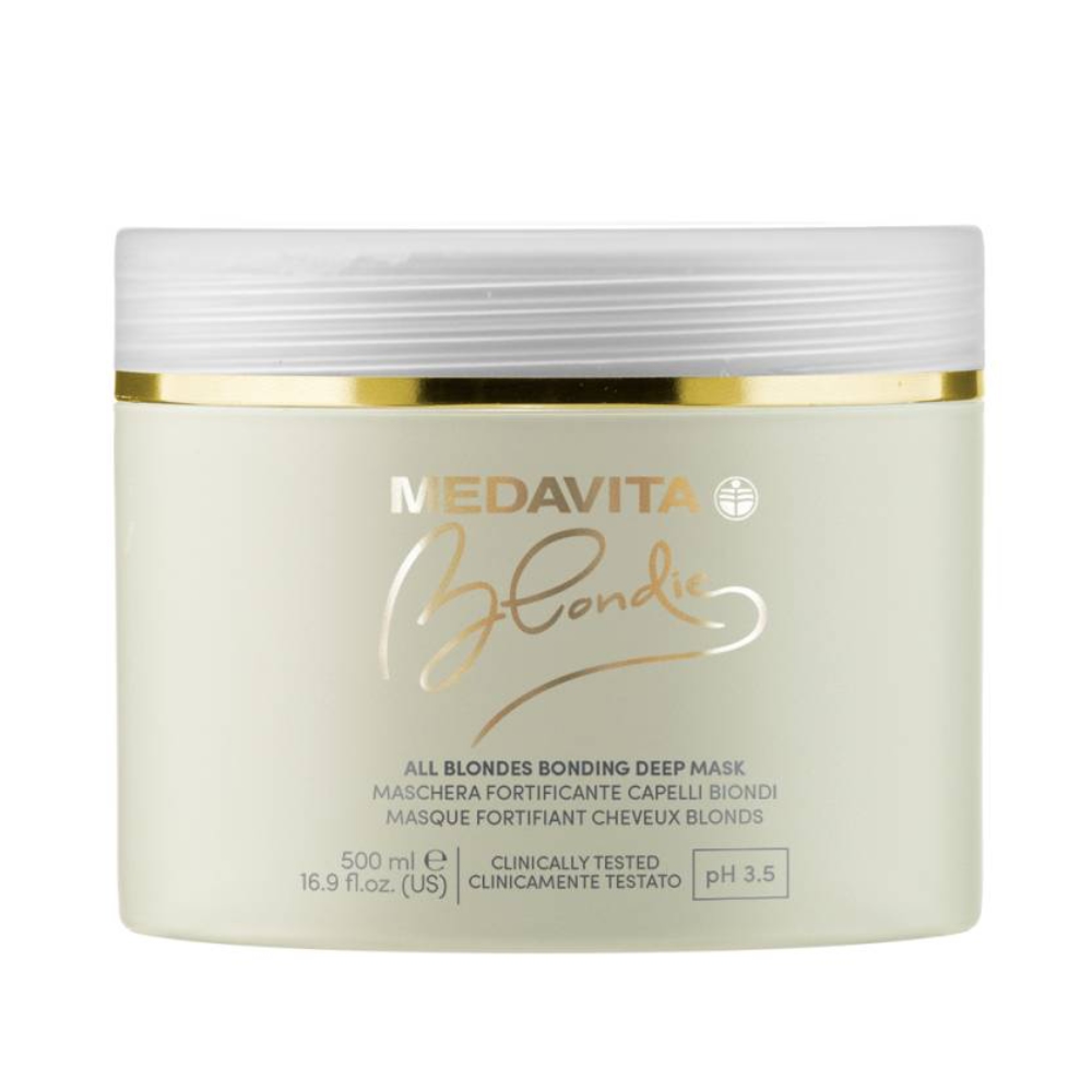 Medavita Blondie All Blondes Bonding Deep Mask s pH 3,5 je posilující hloubková maska na vlasy určená pro všechny typy blond vlasů. Maska proniká do vlasových vláken, chrání vlasy před oxidací a každodenním znečištěním a navrací vlasům jemnost a lesk. Hloubkově působící maska na vlasy odstraňuje nečistoty a usazené polutanty a zanechá blond vlasy oslnivě zářivé a hebké. Posilující bonding systém Medavita Blondie vyrovnává přirozené pH vlasů a stabilizuje vnitřní struktury cilitvých blond vlasů, které jsou náchylné na poškození. Pečlivě vybrané aktivní složky udržují blond vlasy silné a zdravě vypadající. Aktivní složky na bázi komplexu proteinů amaranta, kyseliny hyaluronové, tekutého kolagenu a ceramidů poskytují vlasům dlouhodobou hydrataci, zpevnění a ochranu. Maska na vlasy Medavita Blondie je dermatologicky testována a je hypoalergenní.