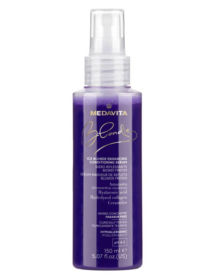 Medavita Blondie ICE Blondes Enhancing Conditioning Serum s pH 4,5 je zvýrazňující bezoplachový kondicionér ve spreji určený pro speciálně pro studené tóny blond vlasů. Hydratační a regenerační kondicionér ve spreji s fialovými pigmenty podtrhuje a zvýrazňuje popelavé, šedivé a stříbrné odlesky vlasů. Pečlivě vybrané aktivní složky udržují studené blond vlasy silné a zdravě vypadající. Výsledkem jsou pružné a zářivé blond vlasy v chladných tónech. Aktivní složky na bázi komplexu proteinů amaranta, kyseliny hyaluronové, tekutého kolagenu a ceramidů poskytují vlasům dlouhodobou hydrataci, zpevnění a ochranu. pěnový kondicionér posiluje oslabená místa ve struktuře vlasu a zesiluje vazby uvnitř vlasových vláken, usnadňuje následnou úpravu vlasů a urychluje rozčesávání. Regenerační sérum je dermatologicky testováno a je hypoalergenní.