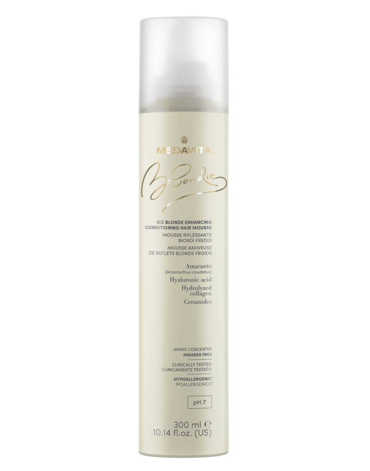 Medavita Blondie ICE Blondes Enhancing Conditioning Hair Mousse s pH 7,0 je zvýrazňující pěnový kondicionér určený pro speciálně pro studené tóny blond vlasů. Hydratační a regenerační kondicionér ve formě pěny v ledovém odstínu podtrhuje a zvýrazňuje popelavé, šedivé a stříbrné odlesky vlasů. Pečlivě vybrané aktivní složky udržují studené blond vlasy silné a zdravě vypadající. Výsledkem jsou pružné a zářivé blond vlasy v chladných tónech. Aktivní složky na bázi komplexu proteinů amaranta, kyseliny hyaluronové, tekutého kolagenu a ceramidů poskytují vlasům dlouhodobou hydrataci, zpevnění a ochranu. pěnový kondicionér posiluje oslabená místa ve struktuře vlasu a zesiluje vazby uvnitř vlasových vláken, usnadňuje následnou úpravu vlasů a urychluje rozčesávání. Regenerační pěna je dermatologicky testována a je hypoalergenní.