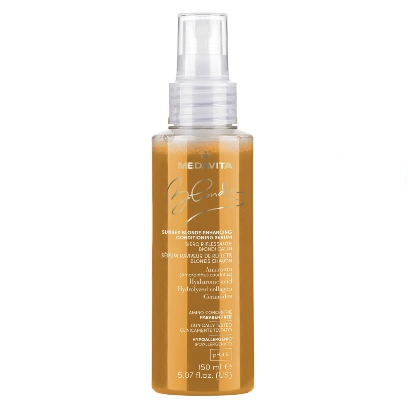Medavita Blondie SUNSET Blondes Enhancing Conditioning Serum s pH 3,5 je zvýrazňující bezoplachový kondicionér ve spreji určený pro speciálně pro zlaté tóny blond vlasů. Hydratační a regenerační kondicionér ve spreji se žlutě-zlatavými pigmenty podtrhuje a zvýrazňuje zlatavé a zlatavě-měděné odlesky vlasů. Pečlivě vybrané aktivní složky udržují zlatavé blond vlasy silné a zdravě vypadající. Výsledkem jsou pružné a zářivé blond vlasy v zlatavých tónech zapadajícího Slunce. Aktivní složky na bázi komplexu proteinů amaranta, kyseliny hyaluronové, tekutého kolagenu a ceramidů poskytují vlasům dlouhodobou hydrataci, zpevnění a ochranu. Regenerační sérum posiluje oslabená místa ve struktuře vlasu a zesiluje vazby uvnitř vlasových vláken, usnadňuje následnou úpravu vlasů a urychluje rozčesávání. Regenerační sérum je dermatologicky testováno a je hypoalergenní.