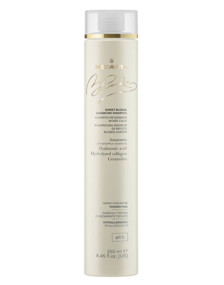 Medavita Blondie SUNSET Blondes Enhancing Shampoo s pH 5,0 je zvýrazňující šampón určený pro speciálně pro teplé tóny blond vlasů. Šampón s obsahem teplého pigmentu v odstínu zapadajícho Slunce podtrhuje a zvýrazňuje zlatavé a zlatavě-měděné odlesky vlasů. Pečlivě vybrané aktivní složky udržují blond vlasy silné a zdravě vypadající. Výsledkem jsou pružné a zářivé blond vlasy v teplých tónech. Aktivní složky na bázi komplexu proteinů amaranta, kyseliny hyaluronové, tekutého kolagenu a ceramidů poskytují vlasům dlouhodobou hydrataci, zpevnění a ochranu. Šampón posiluje oslabená místa ve struktuře vlasu a zesiluje vazby uvnitř vlasových vláken. Šampón je dermatologicky testován a je hypoalergenní.