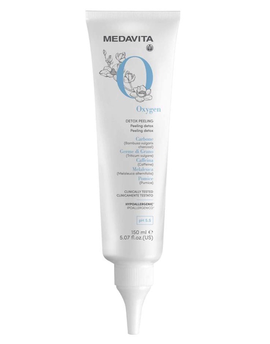 MedaVita Oxygen Peeling Detox pH 5,5 je revitalizační, detoxikační, posilující peeling na vlasy a na vlasovou pokožku, který na sebe váže nečistoty a další polutanty, reguluje tvorbu mazu a okysličuje vlasovou pokožku. Neobsahuje sulfáty SLS, barviva a silikony. Díky kombinovanému působení bambusového uhlí, kofeinu, Tea Tree oleje a extraktů z pšeničných klíčků ulevuje vlasové pokožce od nahromaděných nečistot typických pro městské prostředí. Díky přidanému prášku z pemzy odstraňuje z vlasové pokožky odumřelé kožní buňky a podporuje tvorbu buněk nových. Jedná se o velmi jemnou čisticí, peelingovou a exfoliační masku, která podporuje okysličení vlasové pokožky a vytváří tak živnou půdu pro růst zdravých vlasů a pro omezení vypadávání vlasů.