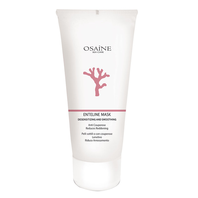 Osaine Enteline Mask - Desensitising and Smoothing Mask. Gelová zpevňující maska pro citlivou, ztenčenou pleť a pleť s růžovkou. Odstraňuje citlivost pleti a snižuje reaktivitu pleti na neuro-smyslovou stimulaci. S mořskou vodou. Obsahuje mořské řasy, rutimin, aloe vera, oxid zinku, bisabolol, fytozom kyseliny 18-β-glycyrrhetinic.