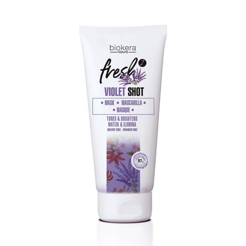 Biokera Natura Fresh Violet Shot maska od Salerm Cosmetics s fialovými a s modrými pigmenty pro odstranění žlutých a oranžových odlesků v melírovaných, zesvětlovaných nebo v blond a šedivých vlasech. Navíc s pečujícím fialovým koktejlem, který zabraňuje stárnutí a oxidaci vlasů. Fialový koktejl zahrnuje extrakty z levandule, černého rybízu, Acai, červené řepy a infúze Indigo. S přírodním aroma levandule a divokého ovoce. Složení je 100 % vegan a 97 % ingrediencí je přírodního původu. Neobsahuje parabeny a sulfáty.