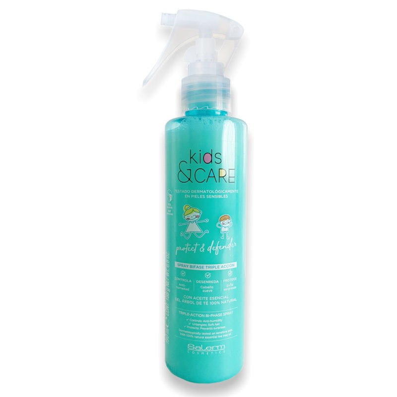 Salerm Kids&Care Protect&Defender dvoufázový sprej s trojitým účinkem pro děti od 2 let. Dvousložkový sprej na vlasy s přírodním rostlinným extraktem tea tree (100% přírodním, bez pesticidů) se vyznačuje svými ochrannými a uklidňujícími účinky. Taktéž chrání před nežádoucím překvapením (zavšivením). Sprej chrání vlasy před teplem žehliček, fénu a škodlivým slunečním zářením. Vlasy budou po aplikaci hebké, hydratované a přirozeně lesklé. Dermatologicky testováno. Vhodné pro citlivé jedince a děti.