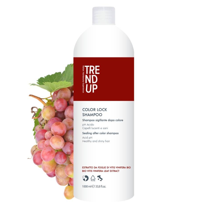 Antioxidační kyselinotvorný šampón Edelstein Trend Up Color Lock (Sealing after Color Shampoo/Acid pH/Healthy and Shiny Hair) je určen pro uzamknutí barevného pigmentu uvnitř vlasového vlákna. Šampón s kyselým pH je ideální péči o barvené vlasy. Šampón důkladně myje vlasy a navrací jim přirozenou krásu. Díky svému kyselému pH napomáhá udržet zářivou barvu vlasů. Kyselinotvorné složky z listů vinné révy v šampónu Trend Up Color Lock napomáhají uzavírat a uhlazovat kutikulu vlasu, čímž navrací vlasům oslnivý lesk. Složení na bázi kyselého pH napomáhá uzavření kutikuly vlasů a udržení tak barevných molekul po delší čas. Šampón zabraňuje předčasnému vymytí barvy a vyblednutí barvy vlivem slunečního záření. Šampón podporuje intenzitu barvy a lesk vlasů.