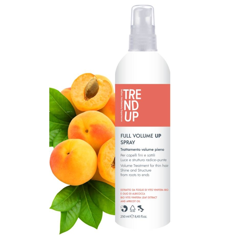 Dejte sbohem zplihlým a mastným vlasům a dopřejte jim dlouhotrvající a bohatý objem. Sprej pro objem od kořínků Trend Up Volume Up Spray (Trattamento Volume pieno/ Volume treatment for Thin Hair Shine and Structure from Roots to Ends) s meruňkovým olejem a extrakty hroznů se postarají o nadýchaný vzhled vlasů. Sprej Vytváří objem už od kořínků vlasů. Účes tak bude vypadat vzdušně, přirozeně a lehko. Vlasy budou objemné a husté na dotek