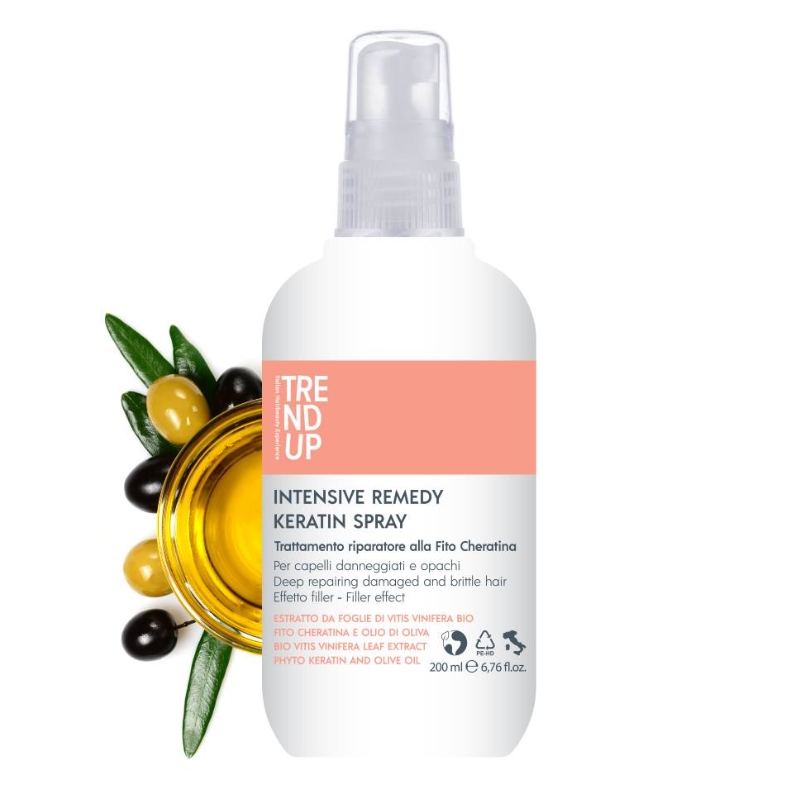 Intenzivní obnovující sprej Edelstein Trend Up Intensive Remedy Keratin (Spray Riparatore alla Fito Cheratina/Deep Repairing Damaged and Brittle Hair/Filler Effect) je specifická péče pro obnovu poškozených a křehkých vlasů s okamžitým účinkem. Péče o extrémně zničené vlasy, která dodává nový život vlasovému vláknu díky účinkům vinné révy a olivového oleje s okamžitým posilujícím a vyplňujícím efektem.