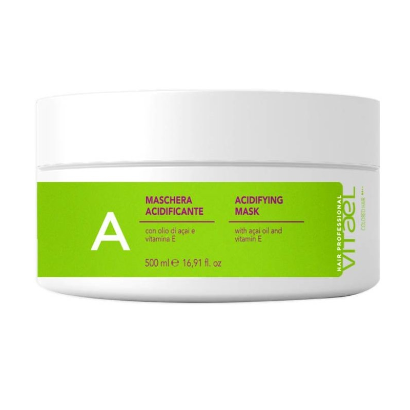 Acidifikační maska pro barvené vlasy Vitalfarco Vitael Colored Hair (Maschera acidificante con Olio di Acai e vitamin E/Acidifying Mask with Acai Oil and Vitamin E) je vhodná pro všechny typy barvených a chemicky ošetřovaných vlasů. Díky kyselinotvorným složkám obnovuje přirozenou rovnováhu vlasů, navrací vitalitu a lesk. Kyselinotvorná maska pro barvené vlasy na bázi komplexu oleje z Acai, ovocných kyselin, vitamínů, UV filtrů, vytváří na povrchu vlasu neviditelný film, který vlasy chrání proti vnějším vlivům. Maska vlasy hloubkově vyživuje a brání vytváření roztřepených konců. Dodává extrémní hebkost a lesk. Ideální pro vlasy chemicky poškozené, pro znovuzískání rovnováhy a pro zachování sytosti odstínu barvy barvených vlasů.