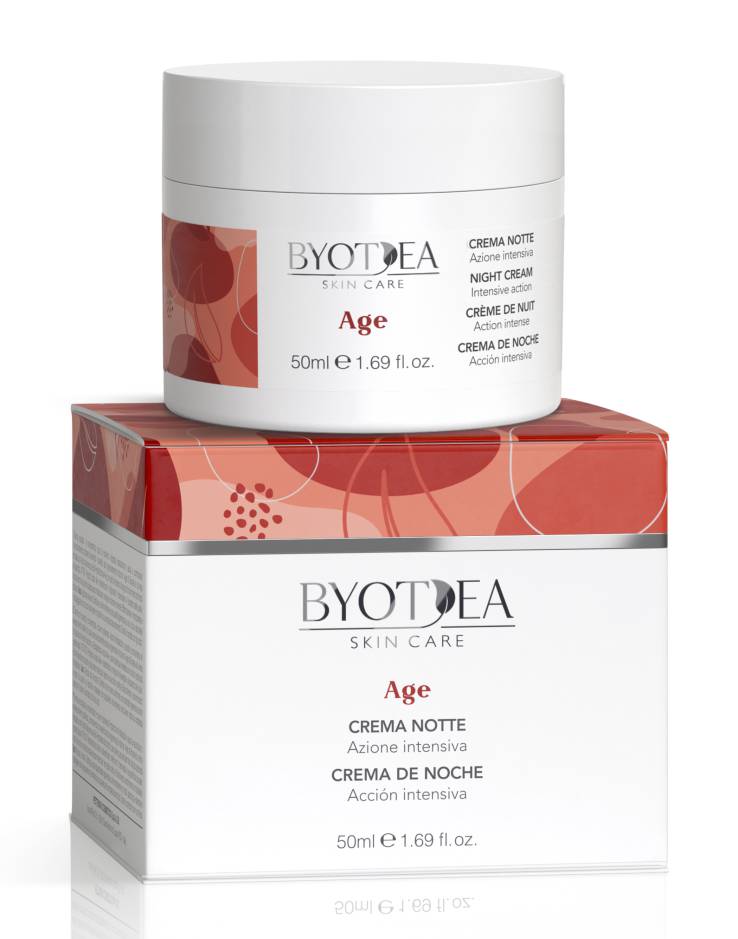 Byotea AGE noční krém (Night Cream/Action Intense) s liftingovým efektem využívá výhody uvolněného spánku pro maximální působení kyseliny hyaluronové. Pleť je hydratovaná a vrásky včetně těch mimických viditelně redukované. Zpevňuje ji, vyrovnává její tón a poskytuje jí ochranu před agresivními činiteli, jež mají negativní vliv na pleť a způsobují její stárnutí. Zajišťuje uvolnění pleti a její pevnost, svěžest a hebkost již od prvního použití. Vyrobeno v Itálii. Krém neobsahuje parabeny, geneticky modifikované složky, parafín, sulfáty SLS nebo SLES.