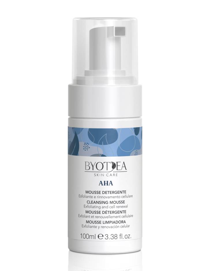 Byotea AHA hloubková stimulační čisticí pěna s alfa-hydroxylovými kyselinami (Mousse Detergente/Esfoliante e rinnovamenti cellulare/Cleansing Mousse/Exfoliationg and Cell Renewal) revitalizuje, vyhlazuje a obnovuje pokožku. Hloubková exfoliační pěna odstraňuje odumřelé kožní buňky, které zpomalují buněčnou obnovu. Pěna čistí, hydratuje a zachovává pleť zdravou a zářící. Dopřejte pokožce dokonalou očistu. Neobsahuje parabeny, geneticky modifikované složky, parafín, sulfáty SLS nebo SLES.