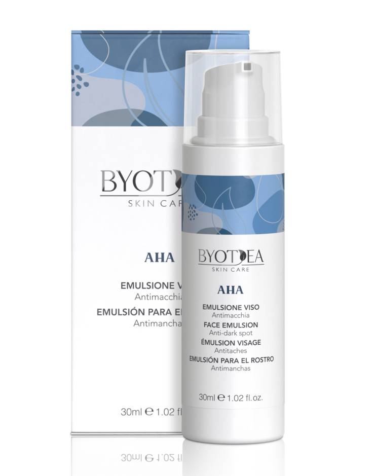 Byotea AHA exfoliační pleťová krémová emulze proti pigmentovým skvrnám (Face Emulsion/Ati-Dark Spot) díky účinným látkám pleť hydratuje, rozjasňuje a pomáhá redukovat hyperpigmentaci. Emulze proti pigmentovým skvrnám účinně bojuje proti vzniku tmavých skvrn způsobených stárnutím pokožky a působením UV záření. Má svěží krémovou texturu, která se rychle vstřebá. Při dlouhodobém používání elimininuje již vzniklé pigmentové skvrny. Vyrobeno v Itálii. Emulze neobsahuje parabeny, geneticky modifikované složky, parafín, sulfáty SLS nebo SLES.