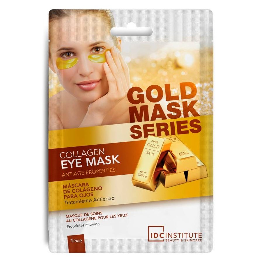 IDC Institute Gold Collagen Eye Mask (Antiage Properties) z řady Gold Mask Series je jednorázová kolagenová maska pod oční okolí s anti-age účinkem, díky dokonalému složení působí intenzivně proti stárnutí, hydratuje, bojuje proti otokům a váčkům pod očima a zanechává pokožku jemnou a hladkou. Má podobu měkkých polštářků, které stačí přiložit na pleť, a můžete nerušeně relaxovat. Dodají pleti hydrataci a postarají se o zklidnění a celkovou regeneraci. Otoky i tmavé kruhy pod očima budou odstraněny, jemné vrásky vyhlazeny a pleť zůstane viditelně pružnější. Obsažený kolagen pomáhá obnovit pružnost pokožky a mladistvost pleti. Obsahuje výtažky Rosolovky řasotvaré je jedna z nejoblíbenějších hub využívána v tradiční čínské medicíně a v poslední době i v kosmetice pro zlepšení stavu pleti díky vysokému obsahu kyseliny hyaluronové. Pleť revitalizuje, hydratuje a rozjasňuje.