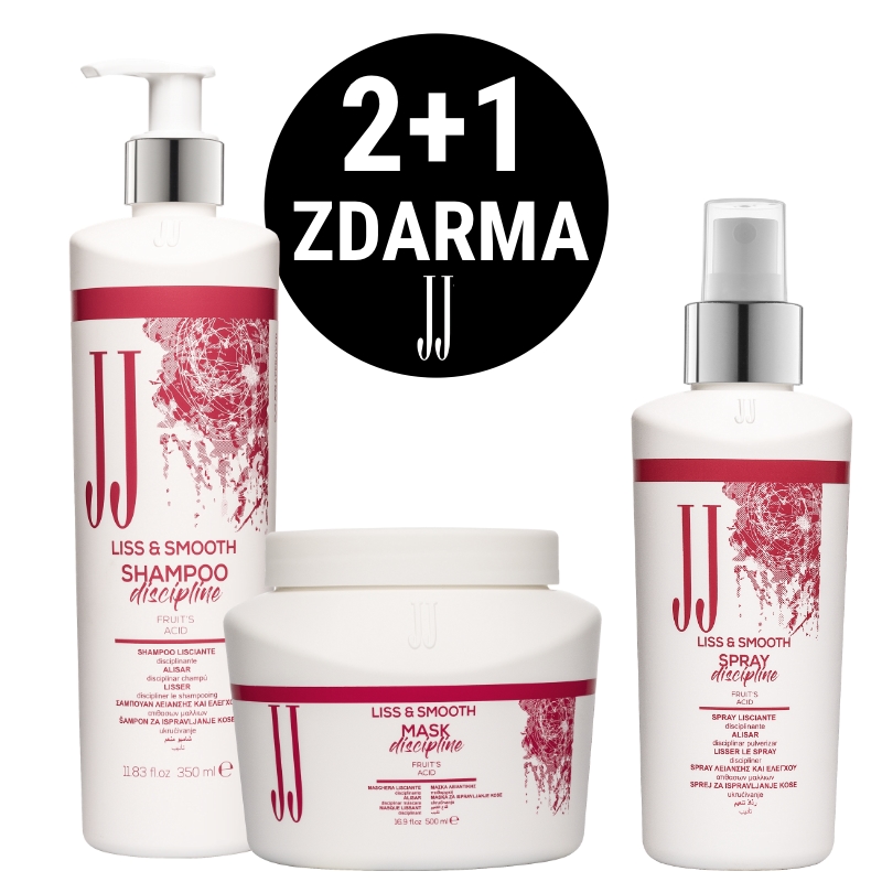 Akce 2+1 zdarma! Začněte péči o své vlasy s JJ Liss & Smooth a užijte si krásné, hladké a lesklé vlasy! K nákupu vyhlazující masky JJ Liss & Smooth 500 ml a vyhlazujícího spreje JJ Liss & Smooth 150 ml získáte zdarma šampon JJ Liss & Smooth 350 ml v hodnotě 307 Kč. JJ Liss & Smooth je určena pro neposlušné a nezkrotné vlasy, které toužíte uhladit a zkrotit. Tato řada obsahuje ovocné kyseliny, které mají schopnost uzavírat kutikuly vlasů a vyhlazovat jejich strukturu. Péče eliminuje nepříjemné krepatění a dodává vlasům lesk a hebkost.