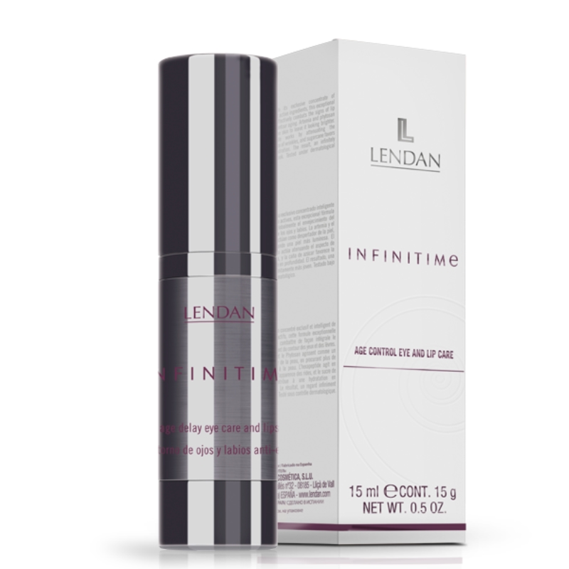 Liftingový krém pro oční okolí a rty Lendan Infinitime (Age Control Eye and Lip Care/Contorno Ojoy y Labios) díky exkluzivnímu a výkonnému obsahu aktivních látek bojuje proti stárnutí kontur očního okolí a rtů. Krém na oční okolí a rty Lendan Infinitime je založen na bázi aktivních přírodních složek, které maximálně redukují vrásky, tmavé kruhy a váčky okolo očí a rtů. Krém obsahuje sójový extrakt (phytosan) a extrakty z planktonu, které probouzí a regenerují buňky pleti. Krém vyhlazuje vrásky a činí pleť jasnější. Hexapeptidy potlačují dermální kontrakci zodpovědnou za vznik hlubokých vrásek. Krém nabízí trojitý liftingový efekt a okamžitě oživuje unavené oči, rozjasňuje kruhy pod očima a maximálně redukuje vrásky. Eliminuje nežádoucí zabarvení pleti, redukuje tmavé kruhy pod očima a přináší svěží, odpočatý vzhled. Po použití bude vaše tvář rozzářená, pevná a perfektně vyživená. Přípravek je dermatologicky testován.