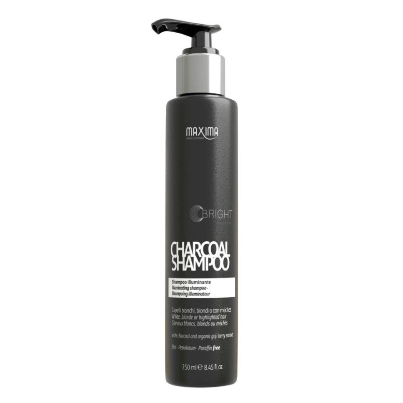 Rozjasňující šampón Maxima Charcoal (Iluminating Shampoo/White, blonde or highlighted hair) s aktivním rostlinným uhlím je určený pro péči o blond, odbarvené nebo melírované vlasy a pro zvýraznění bílých nebo šedých tónů vlasů. Šampón vlasy hloubkově čistí, odstraňuje nečistoty a zanechá vlasy lesklé a hebké. Jedinečný Bright System a speciální fialové neutralizační pigmenty neutralizují teplé žluté a oranžové odlesky, navrací vlasům studenou intenzivní rozzářenou barvu s překvapujícím platinovým efektem s křišťálově lesklými odlesky. Extrakt z plodů Goji, bohatý na vitamíny a antioxidanty, zanechává vlasy silné a chrání je před znečišťujícími látkami. Šampón jemně myje a je vhodný pro všechny typy blond vlasů, u kterých garantuje hydrataci a dodává jemnost.