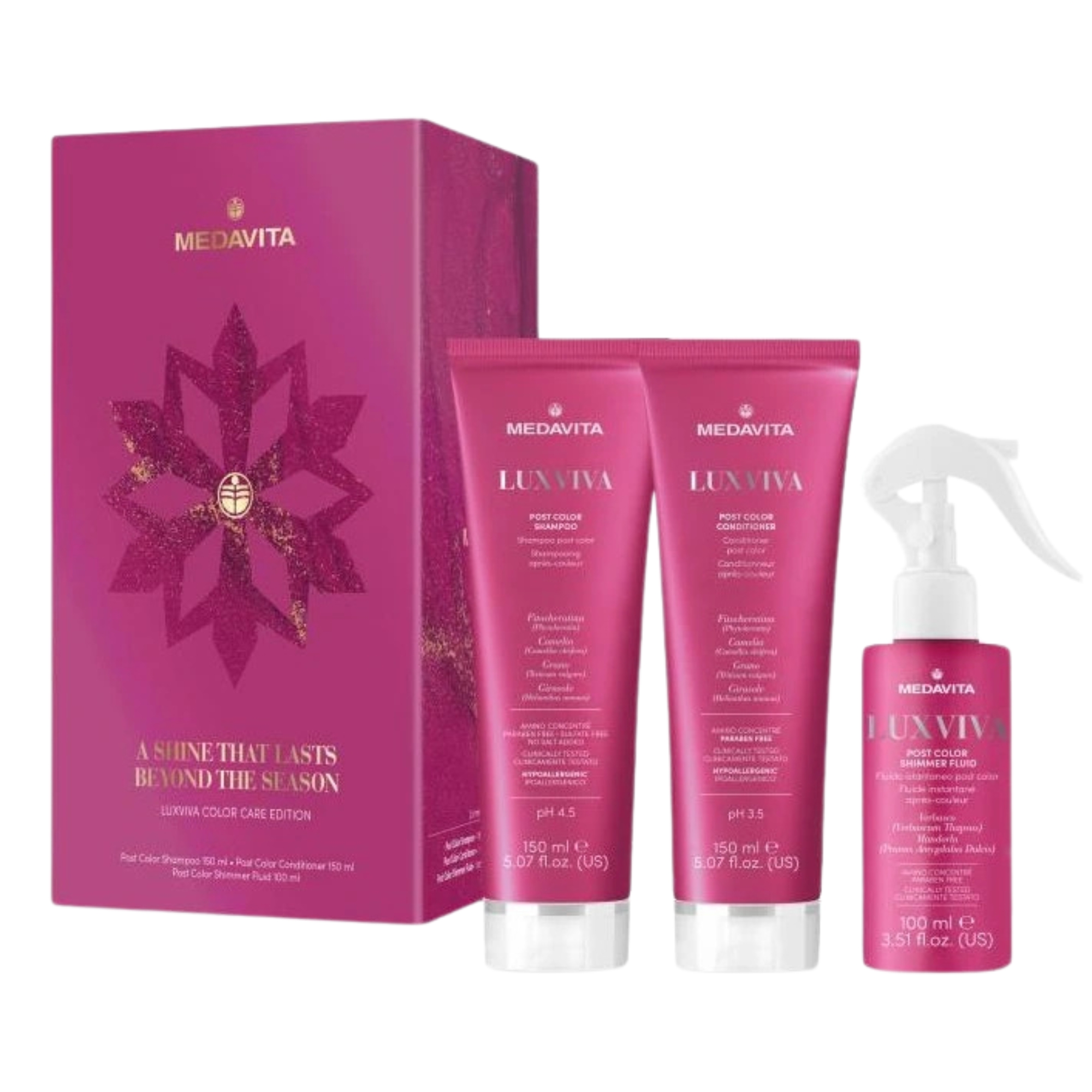 Medavita Luxviva Post Color Shimmer Fluid je profesionální péče o vlasy navržená speciálně pro použití po barvení. Díky svému unikátnímu složení s aminokyselinami a mastnými kyselinami dodává vlasům okamžitý lesk, intenzivní hydrataci a zpevňuje jejich strukturu. Pomáhá uzavřít vlasové kutikuly, čímž prodlužuje trvanlivost barvy a zabraňuje jejímu blednutí. Vlasový fluid vlasy hydratuje, vyživuje, leští, prodlužuje intenzitu barvy, zjemňuje, působí proti volným radikálům, povzbuzuje, regeneruje a posiluje. Obsahuje komplex Amino Concentrée. Rozčesává, vyhlazuje, hydratuje a eliminuje krepatění, přičemž vytváří oslnivý lesk. Výsledkem jsou hydratované, restrukturalizované, zářivé a okouzlující vlasy. Fluid je vhodná pro všechny typy vlasů, zejména pro vlasy normální a hrubé.