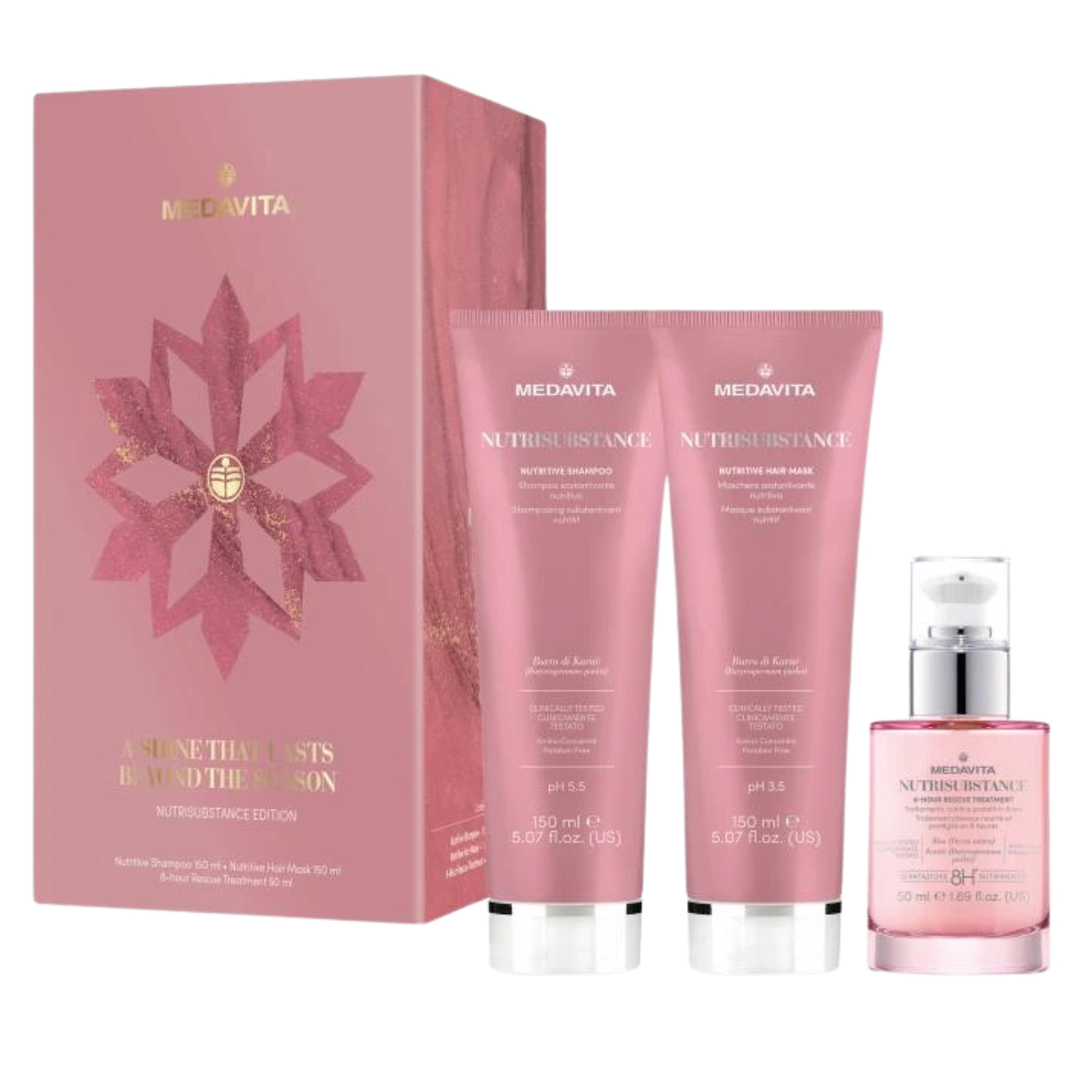 Dárková sada Medavita Nutrisubstance (MedavitaNutrisubstance Edition) je luxusní výživný rituál určený pro suché, oslabené a poškozené vlasy, které potřebují okamžitou regeneraci, hydrataci a návrat přirozené vitality. Tento exkluzivní dárkový set spojuje tři profesionální produkty, které dohromady působí jako intenzivní kúra s efektem „salon care“ v domácím prostředí. Bohaté složení obohacené o přírodní oleje, másla a aktivní výživné látky hloubkově vyživuje vlasové vlákno, obnovuje jeho strukturu a dodává mu oslnivou jemnost i pružnost. Vlasy po aplikaci získávají hebkost, lesk a poddajnost, aniž by byly zatížené. Limitovaná vánoční edice je ztělesněním elegance a péče – ideální dárek pro ty, kteří chtějí dopřát svým vlasům výživu a regeneraci na té nejvyšší úrovni.