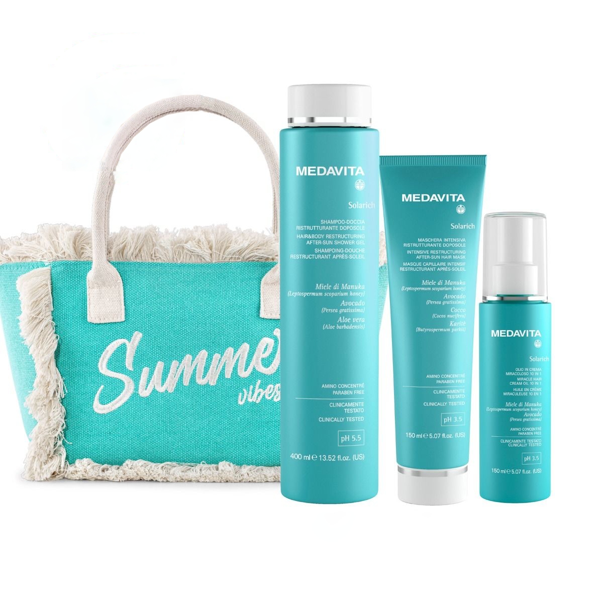 Obsahuje: Produkty v sadě Medavita Solarich obsahují pečlivě vybrané aktivní složky, které poskytují intenzivní péči vlasům i pokožce během slunečných dnů. Manukový med je ceněn pro své silné hydratační, zklidňující a antibakteriální účinky – pomáhá obnovit přirozenou bariéru pokožky a dodává vlasům hebkost a pružnost. Avokádový olej je bohatý na vitaminy A, D a E a esenciální mastné kyseliny, které pronikají hluboko do vlasového vlákna, regenerují, vyživují a chrání před vysušením, aniž by vlasy zatěžovaly. Aloe vera má výjimečné hydratační a zklidňující schopnosti – podporuje hojení podrážděné pokožky hlavy a pomáhá zadržet vlhkost ve vlasech, čímž zvyšuje jejich pružnost. Alantoin působí regeneračně a protizánětlivě, podporuje obnovu buněk a zmírňuje podráždění pokožky po expozici slunci či chlóru. Kolagenové proteiny posilují strukturu vlasů, zvyšují jejich pevnost a pružnost a chrání před mechanickým poškozením. Klíčovým prvkem celé řady je aminokomplex Concentré, což je směs koncentrovaných aminokyselin, které hloubkově obnovují vlasové vlákno, zvyšují jeho odolnost, lesk a vitalitu. Tato účinná synergie aktivních složek poskytuje vlasům maximální ochranu, regeneraci, hydrataci a dlouhodobou krásu v náročných letních podmínkách.