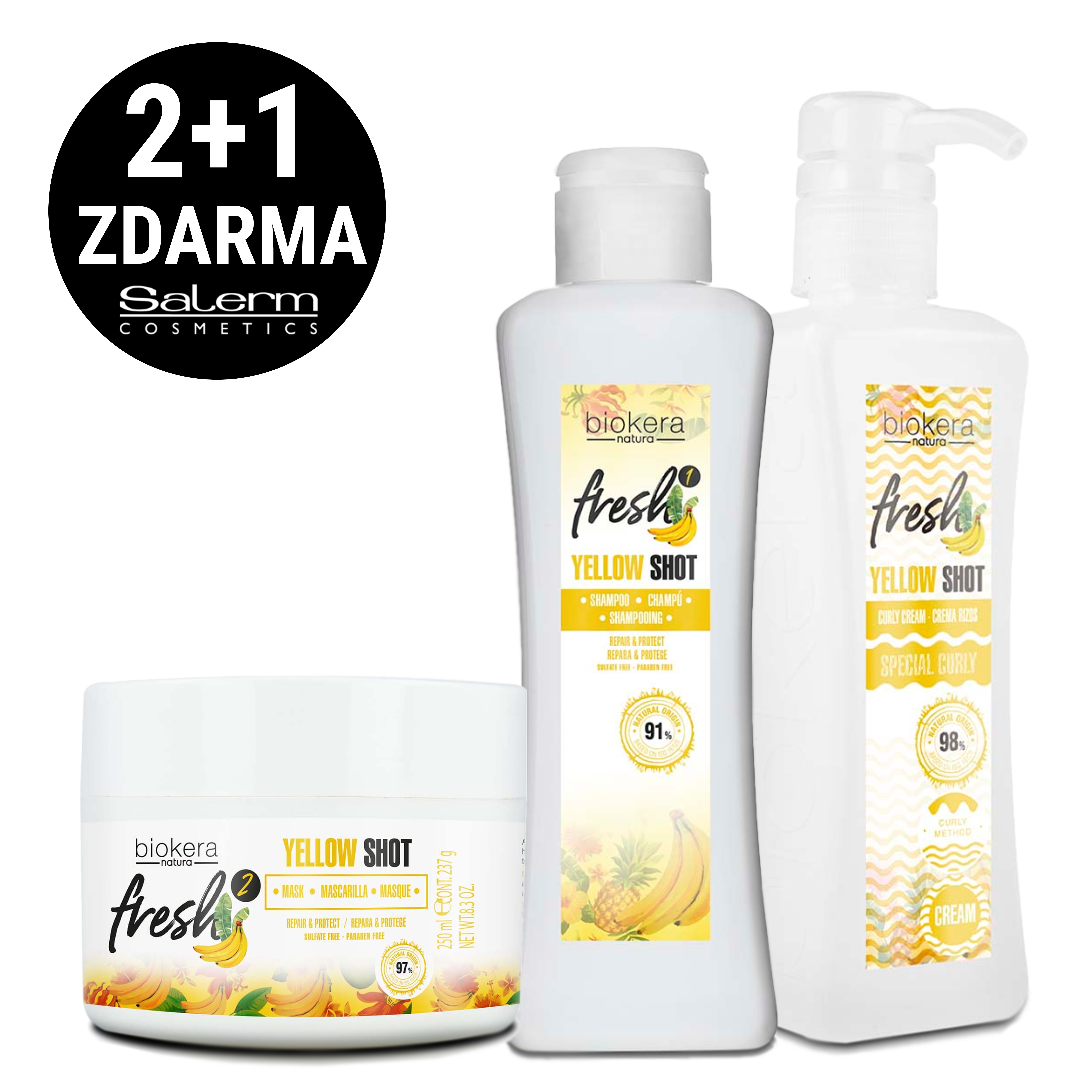 Akce 2+1 zdarma! Limitovaná edice. K nákupu masky pro poškozené vlasy Biokera Fresh Yellow Shot 250 ml a pečujícím krémem pro vlnité vlasy Curl Cream 300 ml získáte zdarma šampón pro poškozené vlasy Biokera Fresh Yellow Shot 300 ml. Péče Biokera Fresh Yellow Shot je 100% veganské ošetření poškozených vlasů s více než 90 % přírodních složek. Ideální rutina pro kudrnaté vlasy! Řada Yellow Shot Special Curly je speciálně určena pro pro vlnité a kudrnaté vlasy, které vyživuje, hydratuje a chrání před krepatěním. Péče dodá vlnitým a kadeřavým vlasům potřebné vitamíny a minerály s vůní banánů. Hlavní ingredience tohoto žlutého koktejlu jsou kanárské banány, mango, ženšen, habešský olej, mandlový olej a květ ylang ylang. Balíček plný vlasové péče jako dárek vždycky potěší. Limitovaná nabídka (pouze do vyprodání zásob).