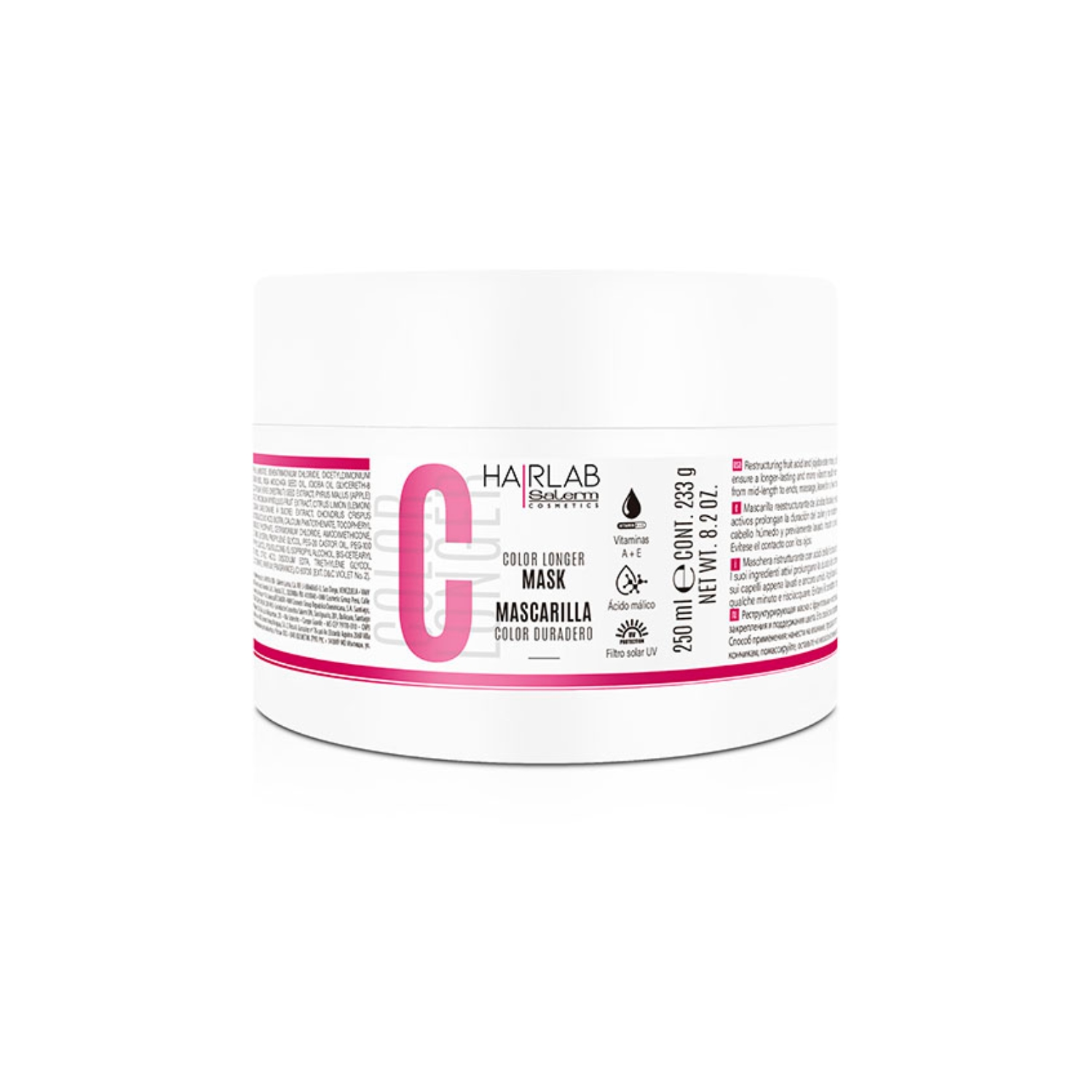 Salerm HAIR LAB Color Longer maska pro barvené vlasy (Color Longer Mask/Mascarilla Color Duradero) pomáhá obnovit oslabenou či poškozenou strukturu vlasů po technickém zásahu jako je barvení vlasů. Maska na kyselé bázi je ideální pro barvené vlasy a díky svému koktejlu ovocných kyselin uzamyká barevné pigmenty ve struktuře vlasů. Jojobový olej a přírodní kyseliny získané z ovoce působí jako silný antioxidant a zabraňují tak stárnutí buněk a krepatění vlasů. Kyselá báze masky napomáhá uzavírat kutikulu vlasového stonku, čímž chrání před ztrátou barevného pigmentu z vlasu. Maska napomáhá nastolit rovnovážné pH vlasů a vlasové pokožky, revitalizuje oslabenou strukturu vlasů a usnadňuje rozčesávání. Vlasům navíc dodává zářivý lesk zvýrazňující krásu barvených vlasů.