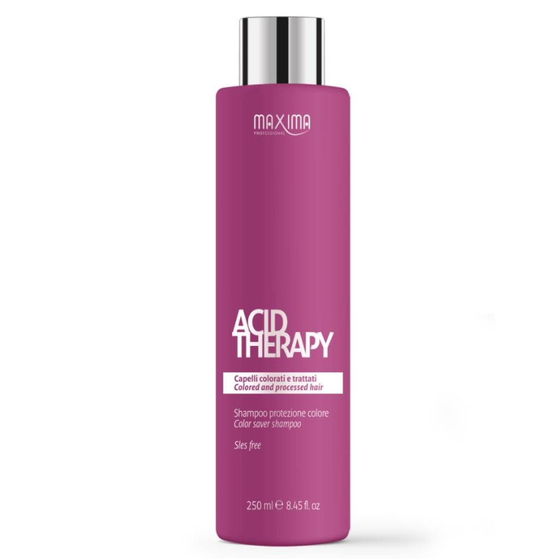Vitalfarco Maxima Acid Therapy šampón na vlasy (Color Saver Shampoo/Shampoo Protezione Colore) s kyselým pH (4,5) ochraňuje a vyvažuje vysušené, poškozené a chemicky upravované vlasy. Šampón stabilizuje přirozené pH vlasové pokožky a vlasového vlákna ihned po barvení a odbarvování, eliminuje stopy zásaditosti z vlasové pokožky a vlasů, přispívá k ochraně přirozené hydrolipidické vrstvy vlasové pokožky a vlasů. Váže barevné pigmenty uvnitř vlasového vlákna, uzavírá a opět vyrovnává vlasové šupiny. Šampón utěsňuje kortex (vlasovou kůru), a tím zabraňuje dehydrataci. Zjemňuje, hydratuje a dodává vlasům lesk. Neobsahuje SLES (laurylethersulfát sodný) a parabeny.